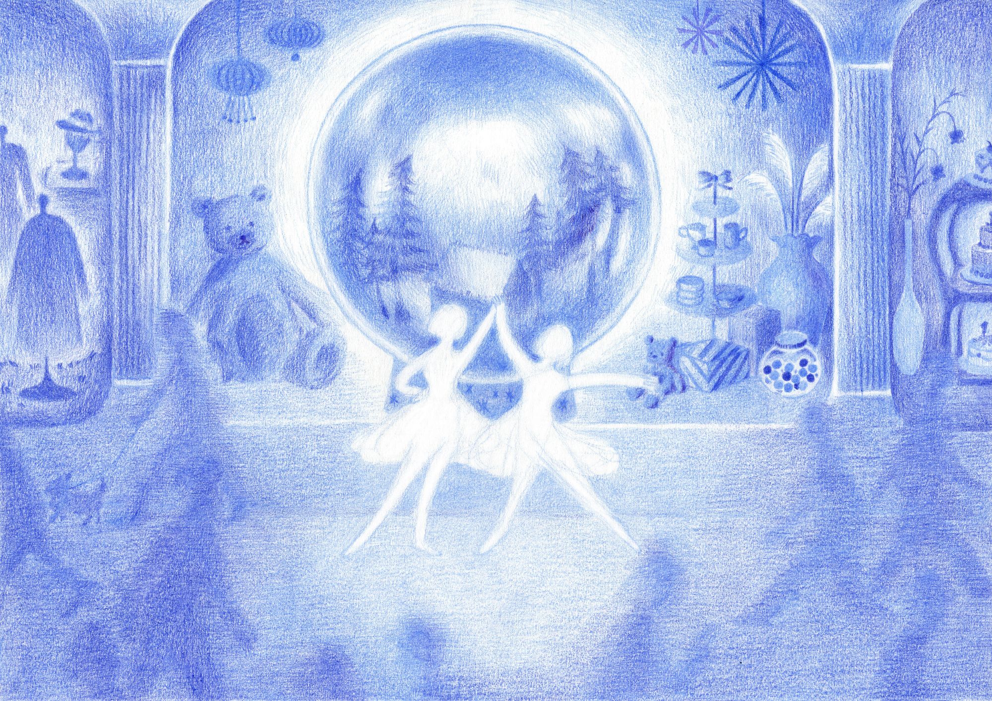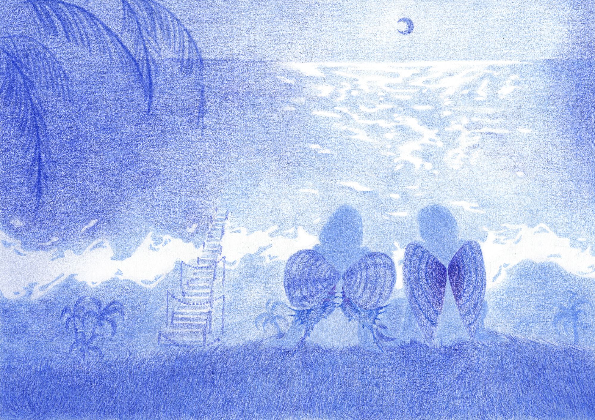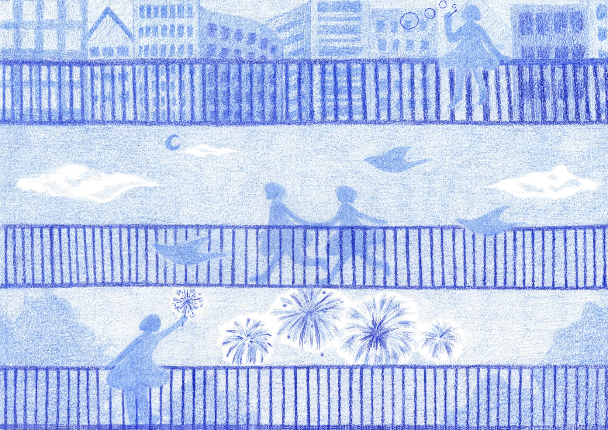 “Self-Talk as Night Falls” is a series of five hand-drawing illustrations created from late 2025 to February 2026. Using a range of blue analogous tones, the works evoke the quiet atmosphere of nightfall and the stillness that comes with being alone. The two identical silhouetted girls represent “the outward self” and “the inner self.” Across different scenes, they accompany each other, converse, or simply sit together, forming a visual narrative about understanding oneself.