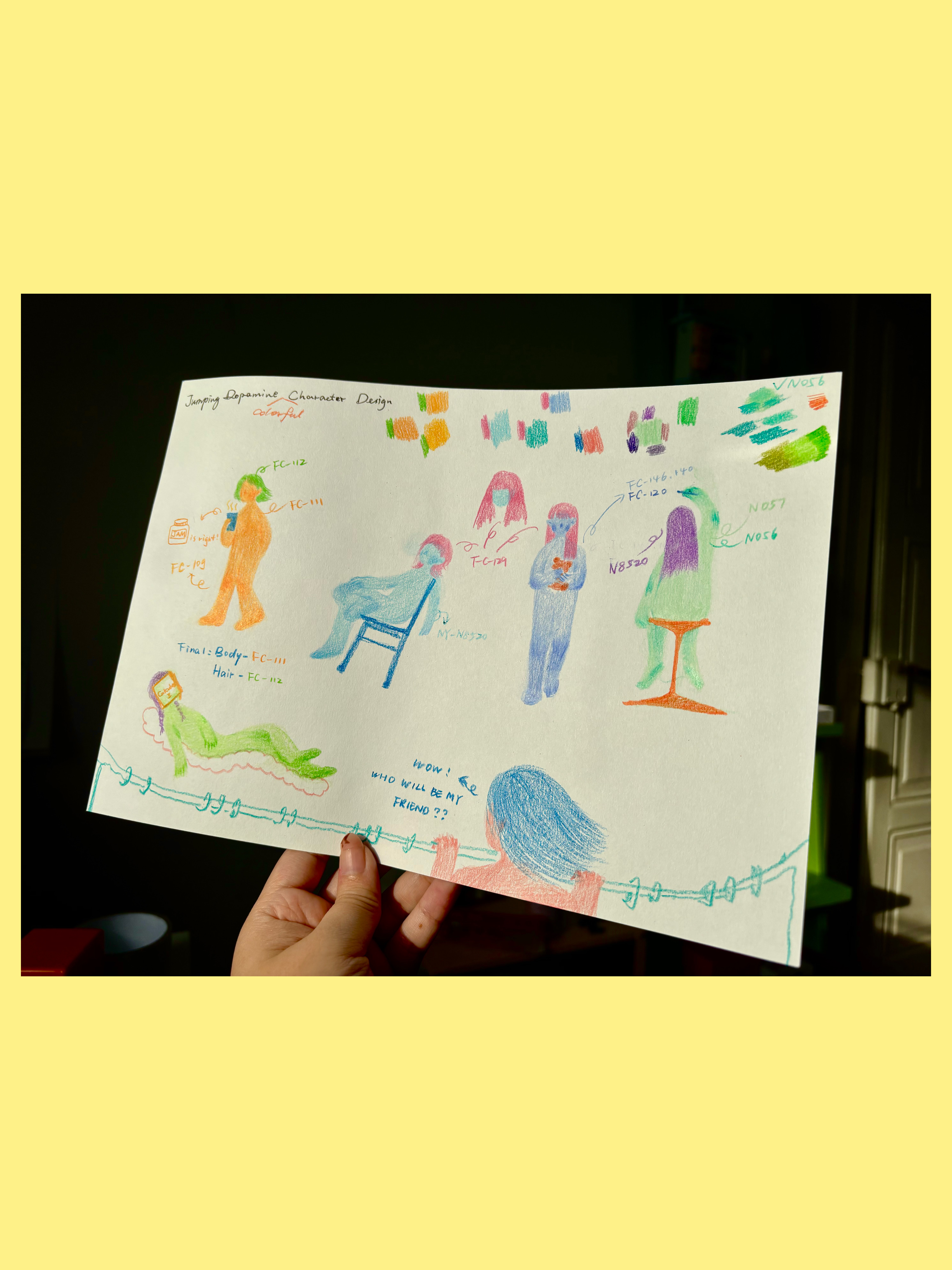 During the creative process, I realized this world might need new characters, so I’ve created some new concept designs. They are colorful figures without facial features, and they are intentionally blank, acting as a mirror for anyone to see themselves in. They’ll be joining the world of Jumping Dopamine in the future.