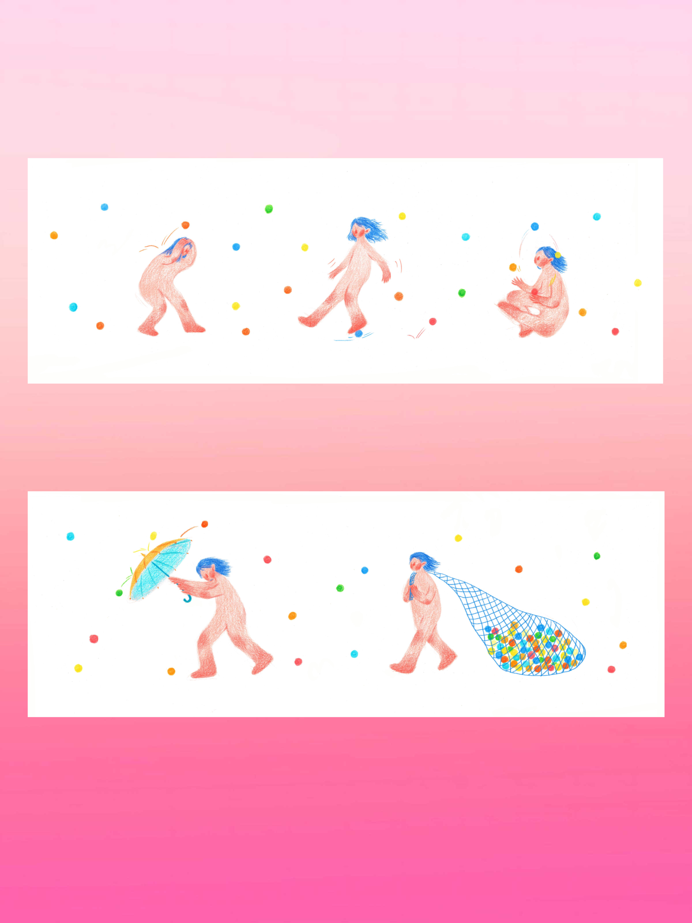 In this world, emotions are like vibrant, bouncing little balls. They might hit you or catch you off guard, but you can also try to catch them, hold them, and play with them. In this book, you’ll see emotions coming from all directions of the protagonist’s life. Some stories might feel warm, ironic, or sad, while others might simply make you smile in quiet recognition. Whatever your reaction, it means you’ve successfully “caught” the ball I tossed to you.